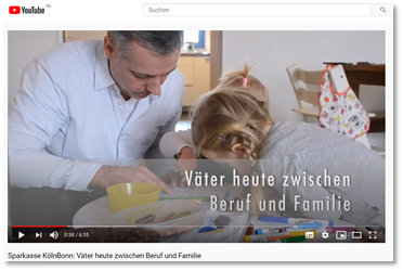 Das hat auch das Väternetzwerk bei der Sparkasse Köln Bonn erkannt und ein kurzes Video über das Väternetzwerk gedreht, das auf YouTube für alle zugänglich ist. Im Film erklären die Mitglieder des Väternetzwerkes, warum sie das Netzwerk gegründet haben, es werden allgemeinen Ursachen für die Probleme der Väter verdeutlicht, Interessierte werden auf den Veranstaltungskalender hingewiesen und am Schluss wirbt die Kerngruppe um Unterstützung, um gemeinsam einen Kulturwandel bei der Sparkasse Köln Bonn voranzutreiben.
