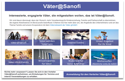 Das hat auch das Väternetzwerk bei Sanofi erkannt und eine Kommunikationsplattform im Intranet geschaffen, die für alle zugänglich ist. Dort findet man alles, was das Väternetzwerk für die Mitarbeiterinnen und Mitarbeiter bietet. Man hat die Möglichkeit, den Newsletter zu abonnieren oder einfach direkt in Kontakt mit dem Väternetzwerk zu treten. Eine großartige Methode, um die Eintrittbarrieren für neue Mitglieder zu senken und die Vernetzung zu fördern.