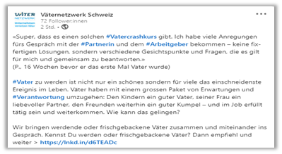 - LinkedIn nutzen, um über interessante Events im Väternetzwerk zu berichten und das Thema immer wieder ins Gespräch zu bringen