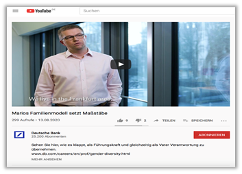 Das hat auch das Väternetzwerk bei der Deutschen Bank erkannt und ein kurzes Video gedreht. Das Video, das auf YouTube für alle zugänglich ist, zeigt einen Kerngruppen-Vater, der deutlich macht, warum er sich für mehr Zeit mit seiner Familie entschieden hat. Er macht deutlich, wie er Familie und Beruf koordiniert bekommt und welche Rolle die Deutsche Bank dabei spielt. Am Ende wird dann auf das Väternetzwerk und seine Funktion im Unternehmen hingewiesen.